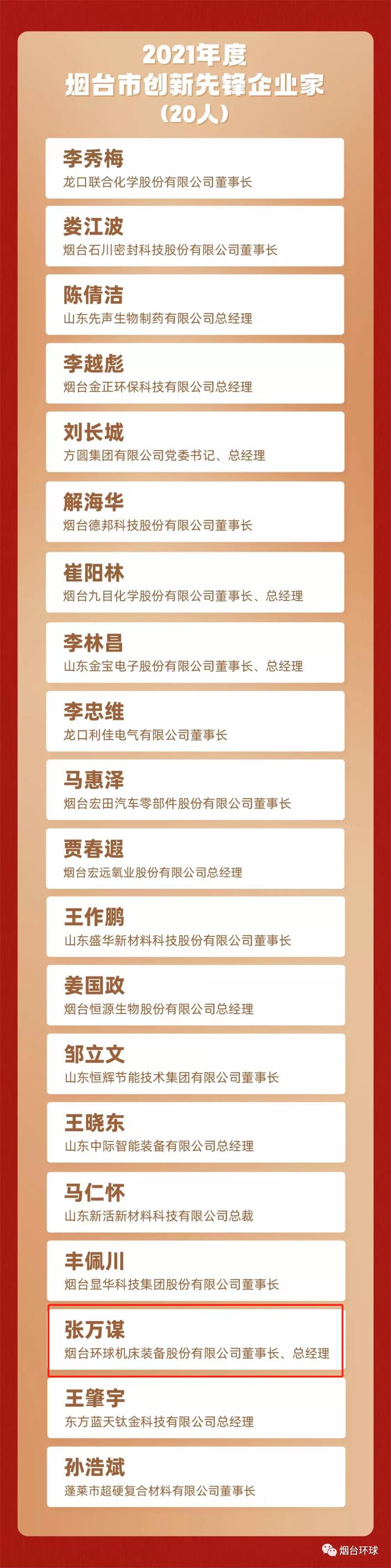 5月5日,在煙臺市2021年工作總結(jié)暨優(yōu)秀企業(yè)家表彰大會上,市委、市政府決定授予煙臺環(huán)球機(jī)床裝備股份有限公司黨委董事長張萬謀等20名同志“2021年度煙臺市創(chuàng)新先鋒企業(yè)家”。